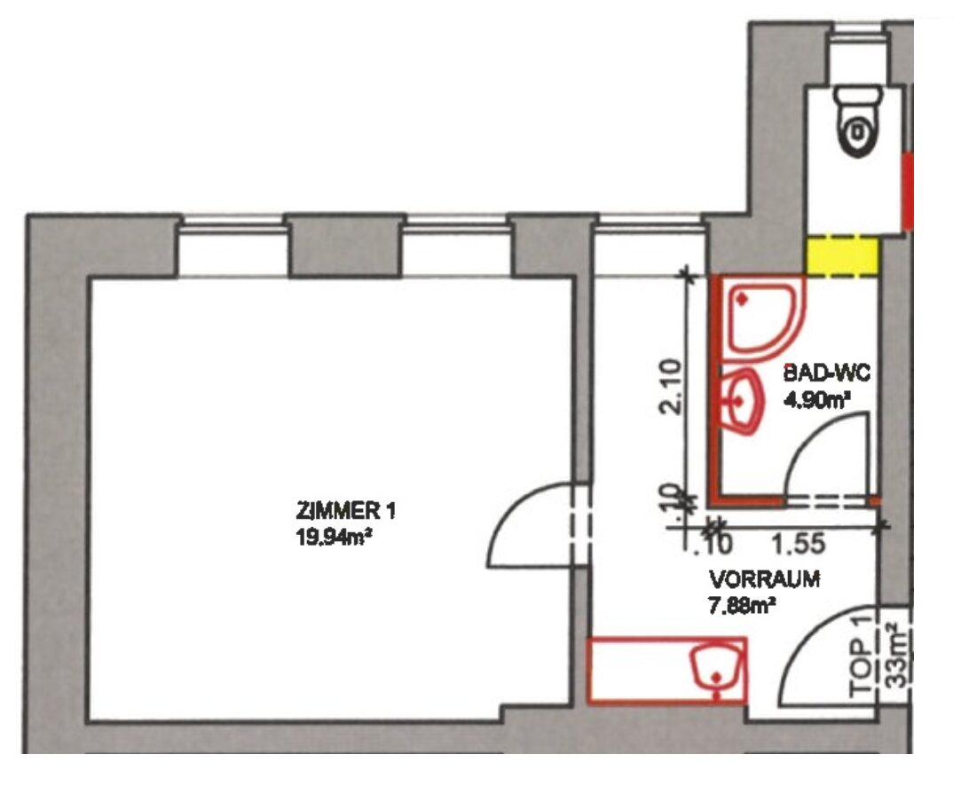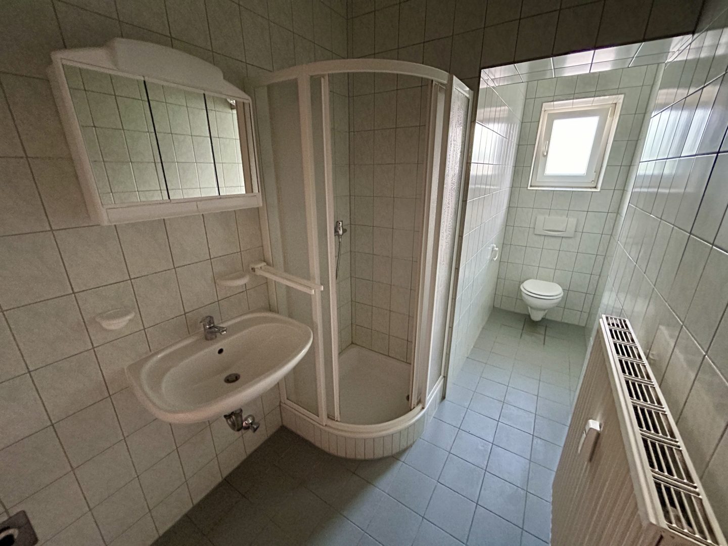 Ebenfalls vom Vorraum aus erreichbar ist das Badezimmer, ausgestattet mit Dusche, WC und Anschluss für eine Waschmaschine.