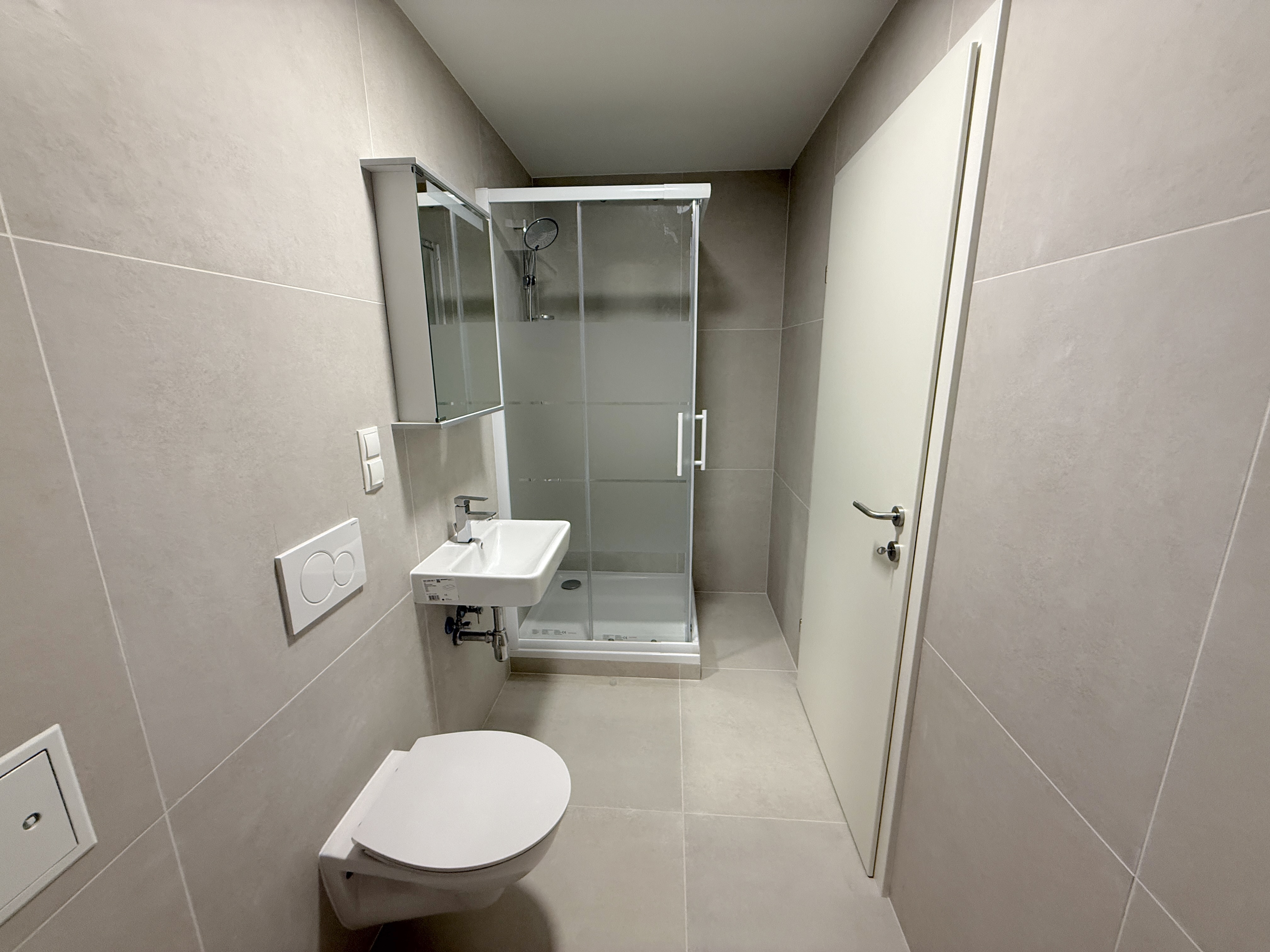 Die Raumaufteilung umfasst ein Schlafzimmer, eine getrennte Küche sowie ein modernes Badezimmer mit Dusche, WC und Waschmaschinenanschluss.